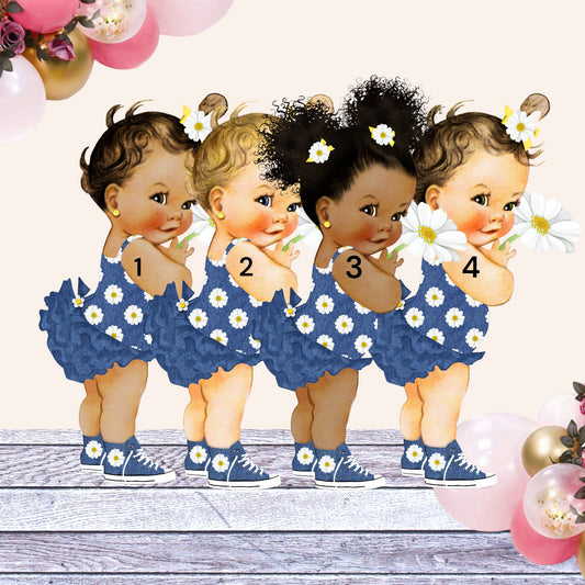 Denim Daisy Baby Girl Centerpiece Cutouts, Cake Topper Baby Shower 1st Birthday Table Decoration Blue White Yellow Sneakers Ruffle Pants