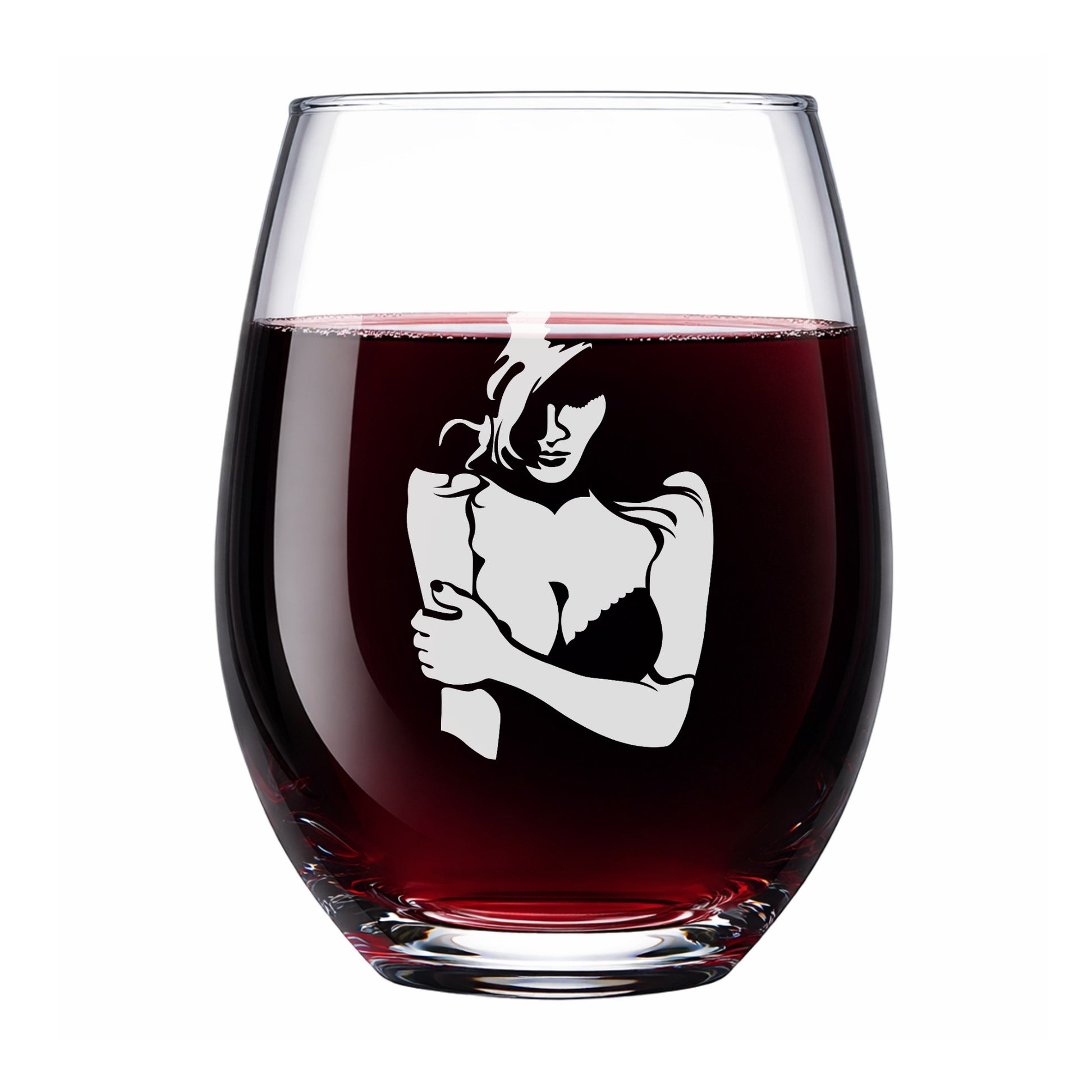 This elegant 9 oz stemless wine glass features a stylish engraved woman silhouette design that adds a modern artistic touch to your drinkware collection. The bold feminine silhouette artwork creates a unique and sophisticated look, making this wine glass perfect for everyday use or special occasions.
