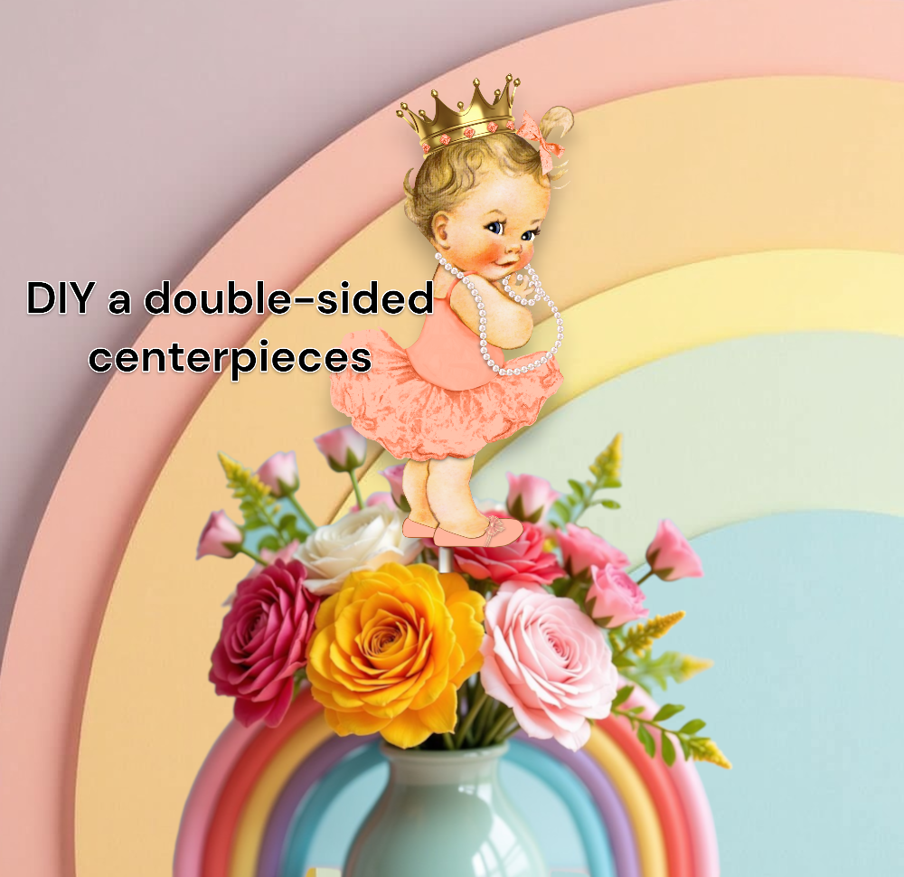 These elegant decorations feature a peach ballerina princess adorned with a delicate tutu and a sparkling gold crown, adding charm and sophistication to any celebration. With left-facing and right-facing designs, they allow for perfectly balanced arrangements and even double-sided applications. Ideal for baby showers, birthdays, or princess-themed events, these versatile cutouts can be used as table centerpieces, backdrop accents, or DIY craft embellishments.